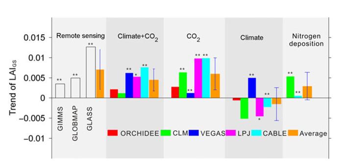 Figure 2. Trend in China's LAIGS over the period 1982-2009 at the country scale for the three satellite remote sensing datasets and five process models described in the text above. Significance levels of 95 and 99 percent are denoted with one and two asterisks, respectively. See the authors' original text (Piao et al., 2015) for additional explanation of this figure.