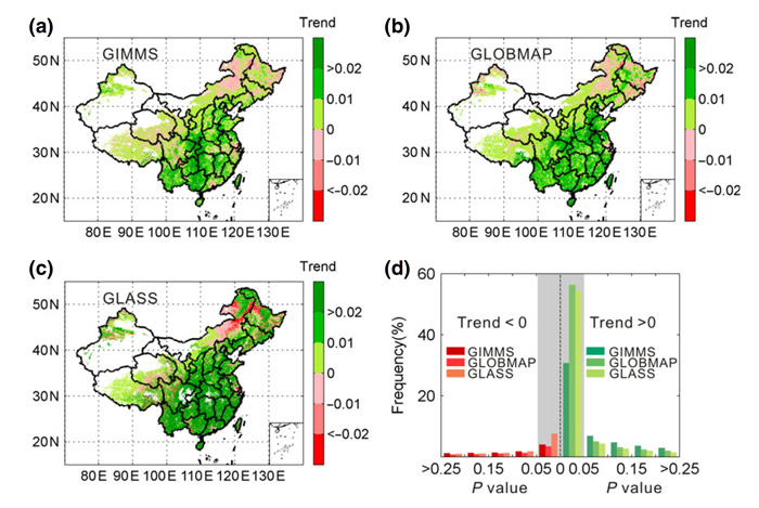 Figure 1. Spatial distribution of the trend in LAIGS over the period 1982-2009 as calculated by the GIMMS dataset (a), GLOBMAP dataset (b) and the GLASS dataset (c). The frequency distribution of the significance level (P value) of the trends calculated for the three LAIGS datasets is shown in panel d.