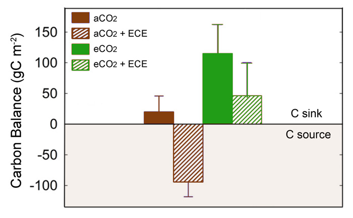 Figure 1. Full growing season (April 26-November 3) ecosystem carbon (C) balance (>0 = sink; <0 = source) as affected by the CO2 and ECE treatments described above. Adapted from Roy et al. (2016).