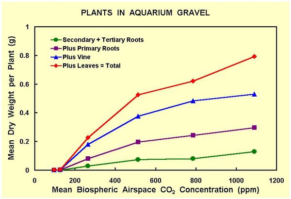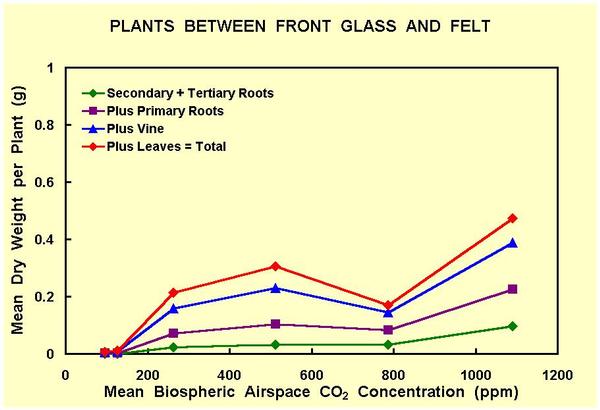 The plant dry weights thus obtained define the primary results of the experiment, which are depicted in Figure 11. As can be seen there, all plant parts contribute in a well-defined manner to the total response of the Pothos plant to atmospheric CO2 enrichment. In the case of the plants that were sandwiched between the front glass of the aquariums and the black felt, however, Tank 5 gave an anomalous result, as shown in Figure 12.
