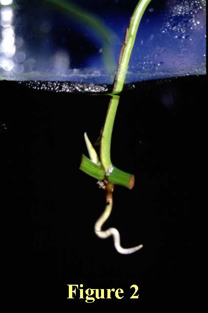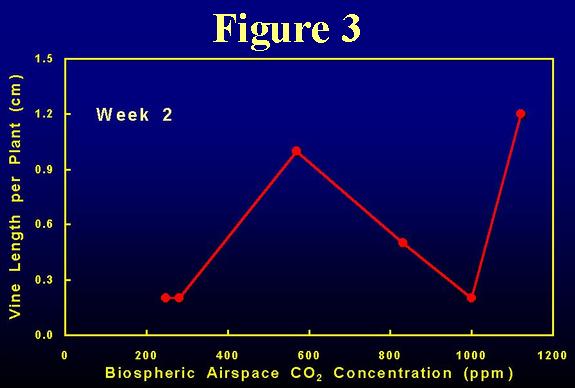 In addition to new root growth, this week also saw the commencement of new vine growth in several of the tanks. Figure 2 depicts this phenomenon in one of the plants of Tank 6, where the new vine is emerging from the junction of the original leaf stem with the original vine. Since new-vine length can also be readily measured for the two front plants of each biosphere, we present the first graph of this parameter as a function of biospheric airspace CO2 concentration in Figure 3.