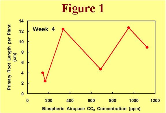 Primary root growth this week was particularly evident in Tank 5, while little change was noted in Tanks 1 and 2, as the long-term average airspace CO2 concentrations in both biospheres dropped below the 200 ppm mark (see Figure 1). Each of these low-CO2 tanks also experienced the loss of a second parent leaf this week.