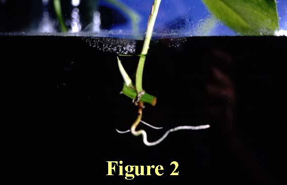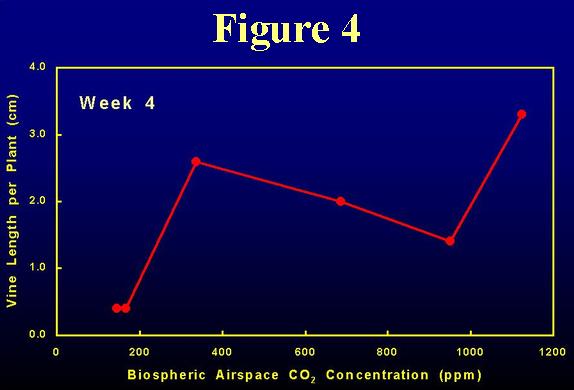 A new development was the commencement of secondary root growth in Tanks 3-6. Figure 2 depicts this phenomenon in Tank 6 and additionally shows the continued development of the new vine shoot. Figure 3 displays the first of these parameters as a function of biospheric airspace CO2 concentration, while Figure 4 displays the second.