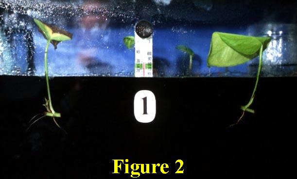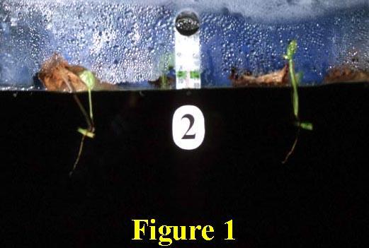 The plants of Tank 1 at 125 ppm CO2 (see Figure 2) have fared a little better, but not by much. One and a third of this biosphere's original plant leaves are still alive (the two front leaves), and none of its three emergent new-vine sprouts has exhibited any signs of dying. In addition, the left front plant has a slightly more extensive root system than both of the two front plants of Tank 2.