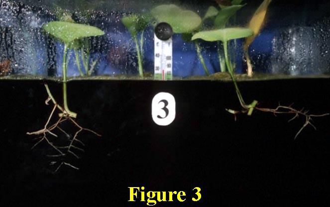 Tank 3 at 256 ppm CO2 (see Figure 3) shows a vast improvement over both Tanks 1 and 2. Only 1.7 of the original seven parent leaves have died; and of the five emergent new-vine sprouts, none shows any signs of dying. Primary roots are also larger and more numerous; and good secondary root systems - which were totally lacking in Tanks 1 and 2 -- are beginning to develop.