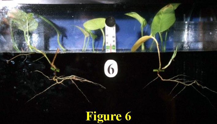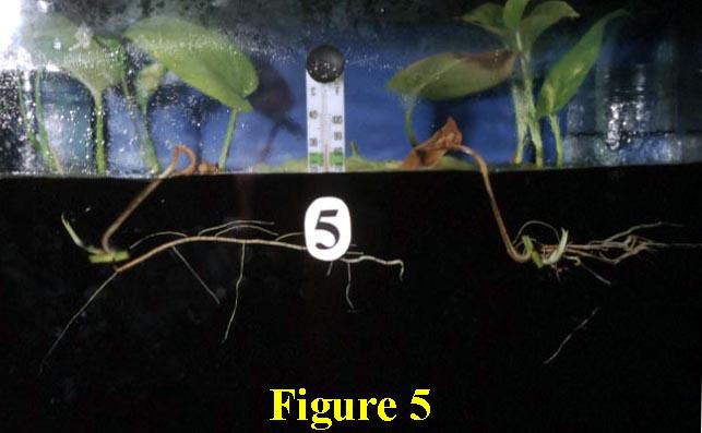Tank 4 at 582 ppm CO2 (see Figure 4) appears not much different from Tank 3 at this juncture of the study. It has slightly less total root length, but two of its primary roots look a little thicker than those of Tank 3. In addition, there appears to be slightly more new-vine length in Tank 4; and although there are three more dead parent leaves than in Tank 3, Tank 4 has one more emergent new-vine sprout. No matter how we squirm on this one, however, we cannot yet claim that the extra 326 ppm CO2 that Tank 4 contains above that of Tank 3 has done it much good yet. But remember, the experiment's still far from over; and much of its results remain hidden in the gravel behind the black felt. In fact, it is conceivable that some of the front plants of the tanks may have been able to send a root or two through the black felt material, which could also confound our results at this stage.