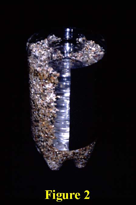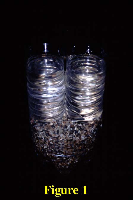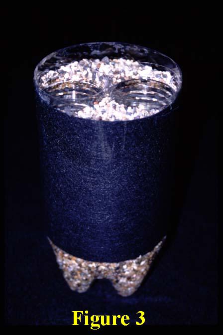 Figure 1 shows how a typical base unit should look at this state of construction, when viewed from the side that does not have the black felt pressed against it. Now, fill the two water bottles with tap water and begin carefully filling the remainder of the pop bottle with more clean aquarium gravel.