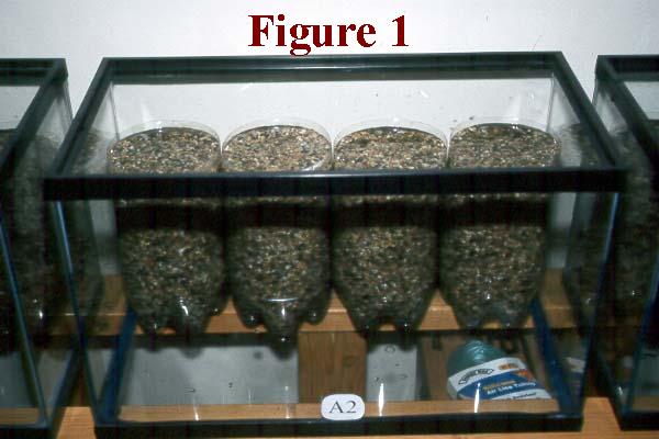 Determine, first of all, where the experimental units will be located and put a ten-gallon aquarium in each of these positions. Then fill four of the 3-liter soda pop bottles, which have had their upper portions removed as described in the setup directions of Experiment #2, to within about 2 cm of their tops with aquarium gravel. Add enough water to these bottles to totally submerge all of the gravel in them, and place them in the back half of the first aquarium, as shown in Figure 1. Then do likewise with each of the other units.