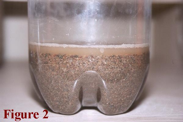Next, fill each of the remaining 3-liter bottles about a fourth of the way up with sand, and add enough water to totally saturate it, shaking the bottle a bit to compress the sand and leave a shallow layer of water above it, as shown in Figure 2.