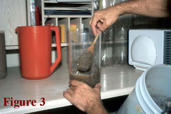 Then pour some new sand into a large bucket and, if necessary, add some water to it and stir with a large wooden or metal spoon to create a moist, but not saturated, mixture. Spoon by spoon, add this moist sand to the quarter-filled bottles, as shown in Figure 3.