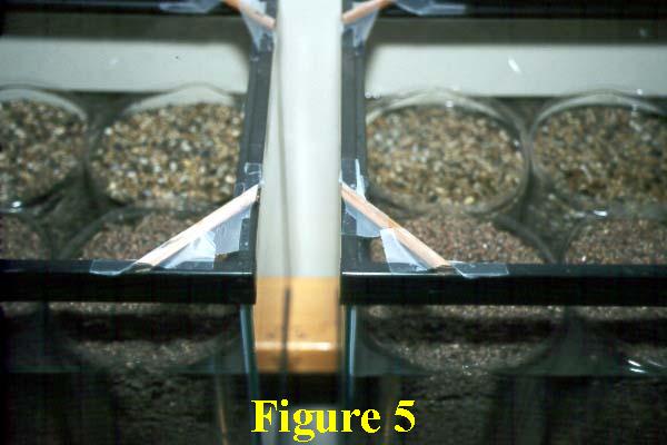 Place four bottles thus filled with moist sand in the front half of each aquarium. Then saw two pencils in half for each unit, preferably with 45-degree cuts through their centers, and make opposing 45-degree cuts at each of the original pencil ends. The resulting pencil halves are to be placed at each of the corners of each aquarium and secured with cellophane tape, as shown in Figure 5.