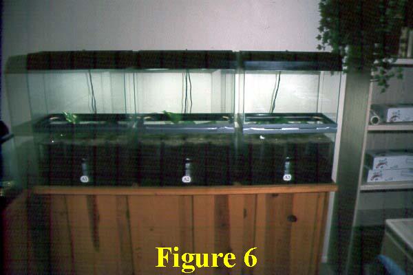 These aquariums should rest upon the pencil halves that are located in each of the upper corners of the lower aquariums. When everything is positioned just right, attach each upper aquarium to the aquarium below it with duct tape, so as to completely cover the space created by the pencils that separate them, thereby isolating the air inside the dual-aquarium units from the air of the room in which they are located. Then put two strip-lights with 15-watt fluorescent bulbs on top of each unit and your experimental setup should look like ours, as portrayed in Figure 6.