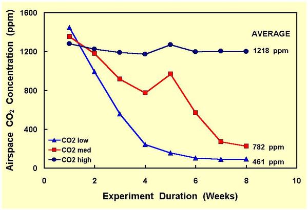 In addition, it appears that the mean CO2 concentration of the last two weeks in the low-CO2 unit (92 ppm) is the value at which death occurs in the peas we studied under the environmental conditions of light, temperature, soil moisture and nutrient content that prevailed in our experiment, which is 369 ppm less than the average experiment-long value of this unit.