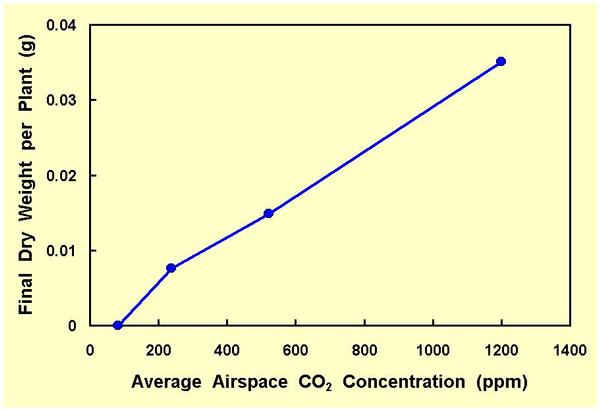 The accompanying figure depicts the final results of the experiment. As in Experiment #3, the first data point was derived by assigning a dry weight of zero to the airspace CO2 concentration at which death occurred. The other data points were obtained by direct measurement of the weights of dry matter produced by the plants in the three experimental units over the course of the study.