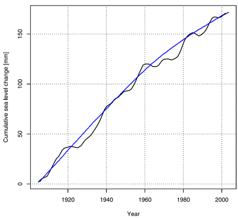 The cumulative increase in mean global sea level (1904-2003) derived from nine high-quality tide gauge records from around the world. Adapted from Holgate (2007).