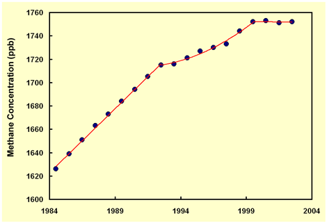 Why are these observations so important? They are important because, as Dulgokencky et al. report, "atmospheric methane's contribution to anthropogenic climate forcing is about half that from CO2 [our italics] when direct and indirect components to its forcing are summed (Hansen and Sato, 2001)." In addition, they note that "all methane emission scenarios considered by the IPCC Special Report on Emission Scenarios (Nakicenovic et al., 2000) resulted in increasing [our italics] atmospheric methane for at least the next 3 decades, and many of the scenarios projected large increases through the 21st century (Prather et al., 2001)." In reality, however, it now appears that a large portion of the anticipated global warming problem may have simply disappeared, rather than gotten much worse, as Hansen claims.
