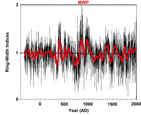 With respect to the data depicted above, Zhang et al. additionally say that "corresponding to the North Atlantic MWP, the ring widths were increased ... during AD 929-1031, with the peak occurring around AD 974," and they go on to state that these observations mesh well with what Esper et al. (Science 295: 2250-2253) had earlier found, i.e., that "long tree-ring chronologies in the Northern Hemisphere extra-tropics ... indicated that the warmest period covers the interval AD 950-1045, with the peak occurring around AD 990." This observation further suggests that the peak warmth of the Dulan area likely also occurred at this time, implying that the peak warmth of the MWP in that part of the world was greater than the peak warmth experienced there during the late 20th century.